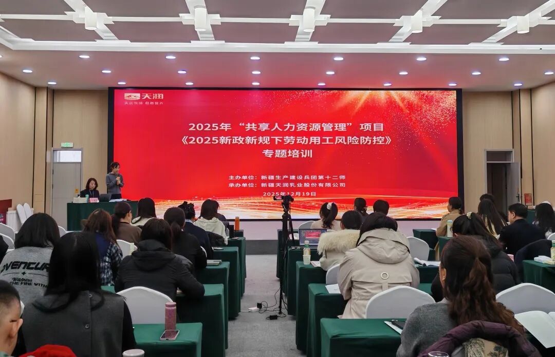 为助力人力资源管理人员精准把握2025年劳动领域政策导向,筑牢劳动用工合规防线,全面提升劳动关系治理与风险防控专业能力,12月19日,天润乳业(600419)依托“共享人力资源管理项目”,在兵旅园林酒店组织开展了《2025新政新规下劳动用工风险防控》专题培训,来自十二师各权属国有企业及天润乳业各板块的人力资源负责人及业务骨干共70人参加。