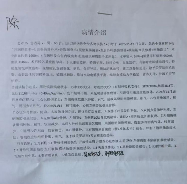 据新桥医院的病历单据显示,陈奎,今年60岁,经诊断为:刀刺伤、开放性胸部损伤、开放性血胸、开放性心包积液、心脏裂伤、血性休克等。“受伤的女孩现在跟我父亲在同一个重症监护室里,父亲面部浮肿,已经完全看不出来是他了。”陈女士说。
