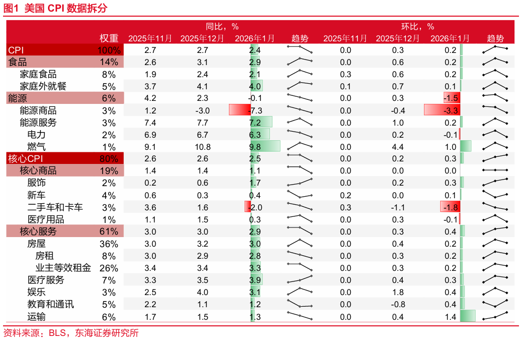 事件:当地时间2月13日,美国劳工局公布2026年1月美国CPI数据。美国1月未季调CPI同比2.4%,预期2.5%,前值2.7%;核心CPI同比2.5%,预期2.5%,前值2.6%。季调后CPI环比0.2%,预期0.3%,前值0.3%;核心CPI环比0.3%,预期0.3%,前值0.2%。