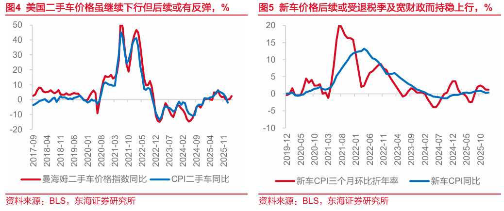核心商品价格仍或存在上行风险。核心商品价格在1月呈现出涨跌不一的情况。其中,和关税挂钩较深的服饰以及新车价格均有环比上行压力,前者环比升0.3%,前值0.2%,后者升0.1%,前值0.0%。二手车价格虽然在当月回落较多(同比降2.0%,前值升1.6%;环比下降1.8%,前值降1.1%),但先行指标曼海姆二手车价格指数显示后两月价格或有温和抬升。往后来看,随着个人退税季以及财政补贴的逐渐落地,我们预计后续消费或有被进一步刺激的空间,新车和二手车等耐用品价格均存在上行风险。