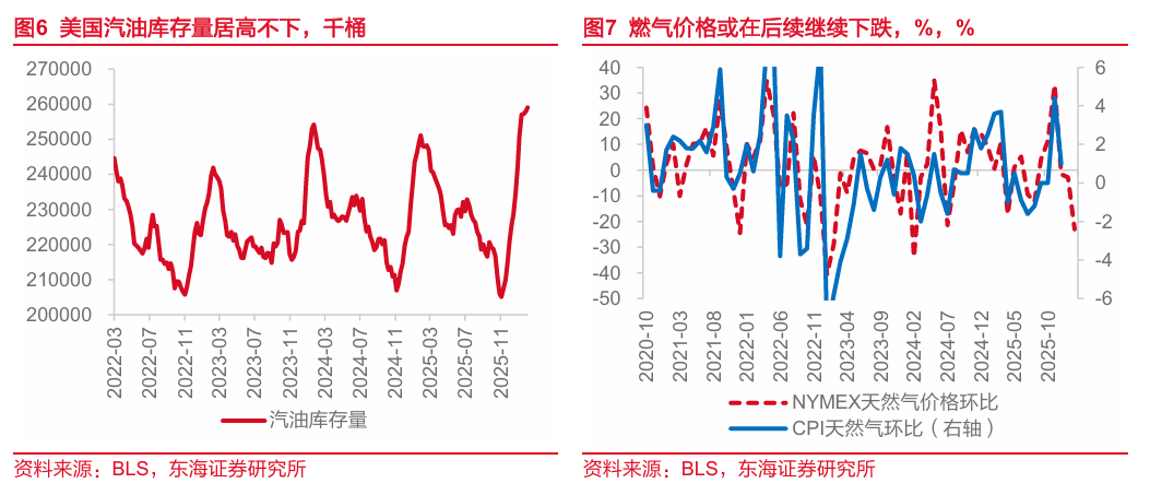 1月食品和能源服务价格回落是通胀下行的主要推手。1月食品价格环比升0.2%,前值升0.6%,主要受鸡蛋价格继续回落影响。能源价格同样回落明显,环比下降1.5%,前值0.3%,主要则是受汽油及天然气供给充足影响:1月能源商品价格环比下降3.3%,前值下降0.4%;能源服务价格环比升0.2%,前值升1.0%,其中燃气环比变动由前值升4.4%下滑到升1.0%。后续来看,由于汽油库存依然维持高位并且燃气期货价格持续的下跌,能源通胀后续或仍在低位徘徊。